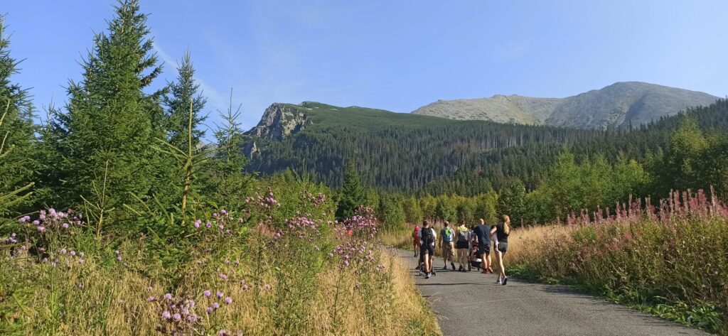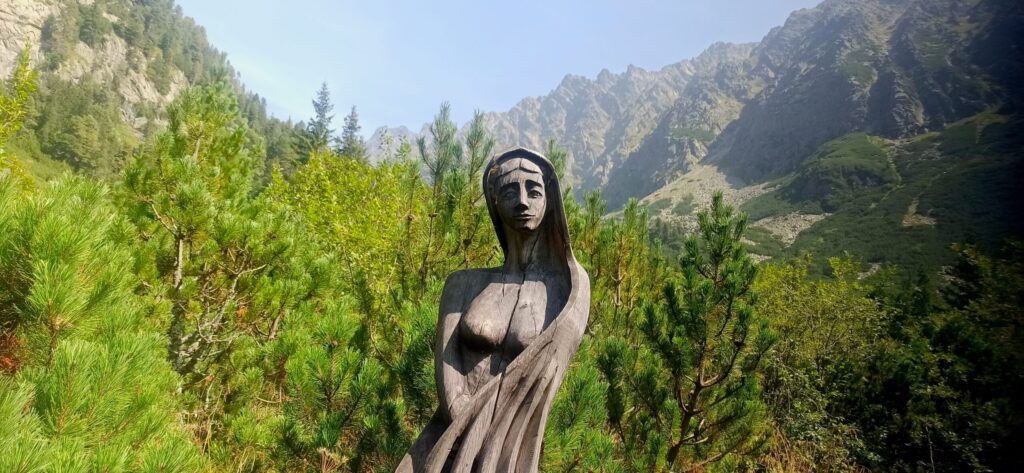 From the train station (on the supermarket side), follow the asphalt road to the right. The path leads past a few wooden statues and souvenir kiosks before reaching a parking lot. There are clear signs pointing the way toward Popradské Pleso—and yes, you won’t be the only one going there, it’s a popular spot.