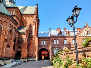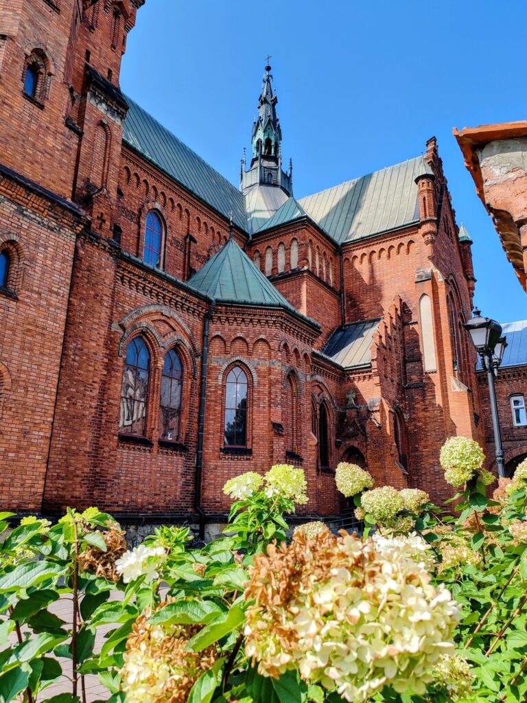 I stepped off the train and started walking toward what I assumed was the centre or the old town. And then this happened – a massive brick neo-Gothic church rose in front of me. Standing casually in the middle of running cars and busy streets with its mighty towers cutting into the sky. Around it were bushes of white flowers—large, round, almost weighty in themselves. White, but not light. There was a passage decorated with colourful stained glass, unexpectedly vivid against the scale of the structure. This is the Church of The Holy Family.