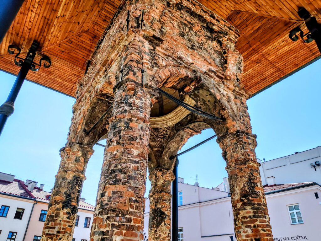 Following the street beyond the gallery, I reached a fenced arch at the end of the road. I followed the green roof and suddenly found myself facing the remains of an old synagogue. In 1939, Tarnów’s synagogue was burned by Nazis and later demolished. What remained is the Bimah — the place from which the Torah was read during ceremonies. Today it proudly stands fenced, in the middle of a square.