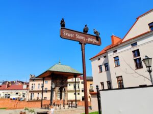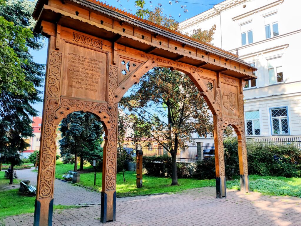 I wandered through another square with fountains and a street-art city map, found yet another small metal being along the way, and slowly headed back toward the train station. Just before leaving, I noticed one last peculiar detail: a wooden carved gate. It looked strikingly different from everything around it. It turned out to be a gift from Hungary, carved in traditional Hungarian style. There are only three gates like this in the entire country — and somehow, I stumbled upon one of them here in Tarnów. These gates celebrate shared history and friendship between Poland and Hungary.